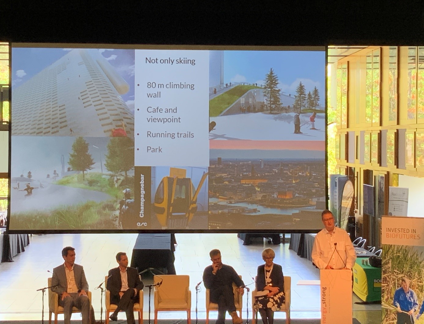 Inge Johansson – researcher at Research Institutes of Sweden talked about a great bioenergy hub that takes waste from the surrounding areas and generates energy (heat and electricity) in Copenhagen. Normally facilities like this are set away from highly populated areas, but this one is right in the guts of the city and offers a ski slope, cafe and parklands on its roof! This is one of the most advanced and waste to energy facility in the world.